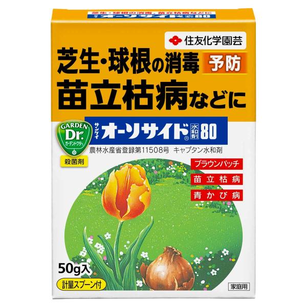 「オーソサイド水和剤」というパウダー状の製品です。水に溶かしてスプレーします。